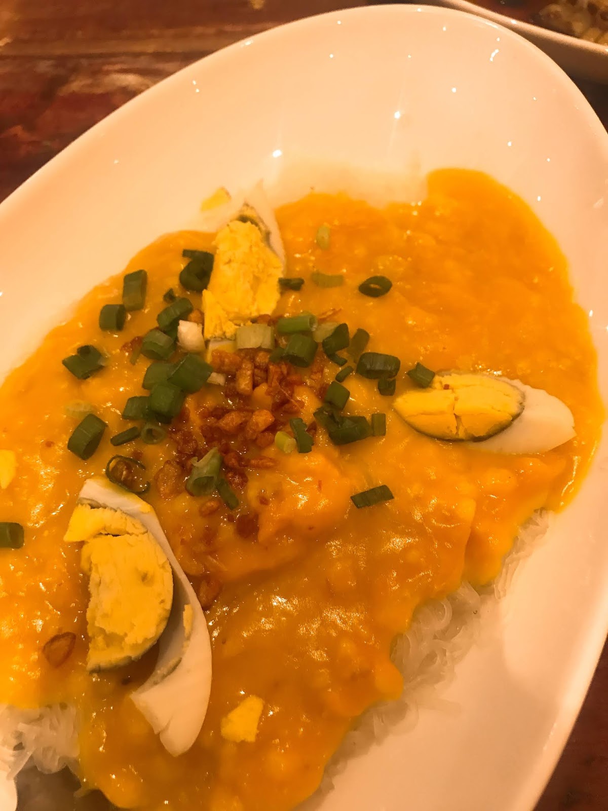 Egg noodles, fish balls, prawns, squid and tofu in spicy coconut curry soup.