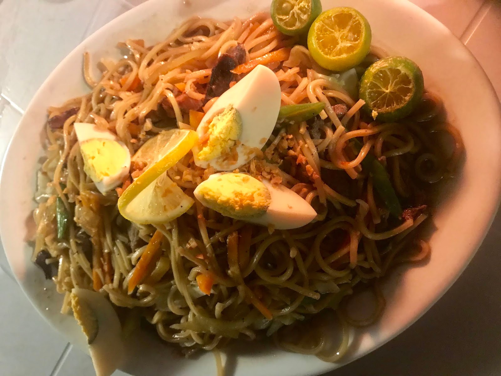 A noodle dish with chopped crispy lechon kawali, pork igado (Pork liver stew), vegetables, hard-boiled quail egg and then smothered in savoury thick sauce.
