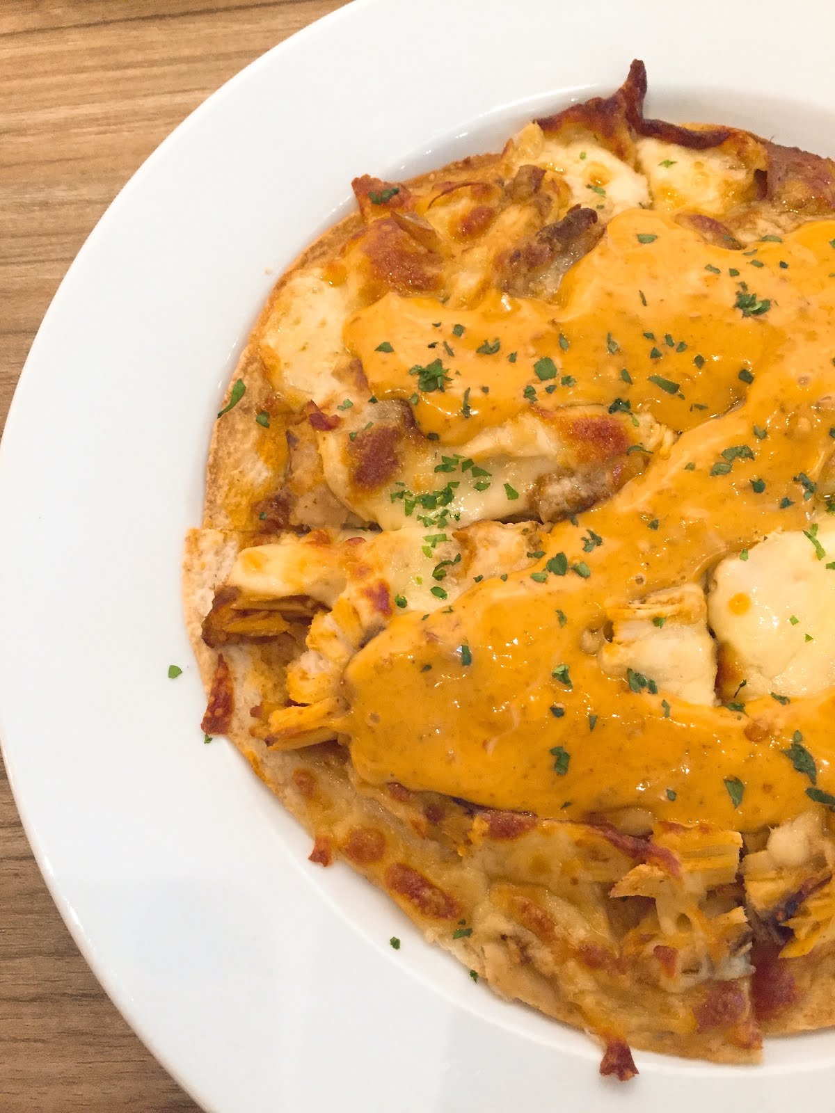 Thin crusted pizza loaded with shredded chicken, parmesan cheese, and peri-peri sauce. Baked to crispy perfection. However, it was covered with the peri-peri sauce which was overwhelming and super duper spicy!