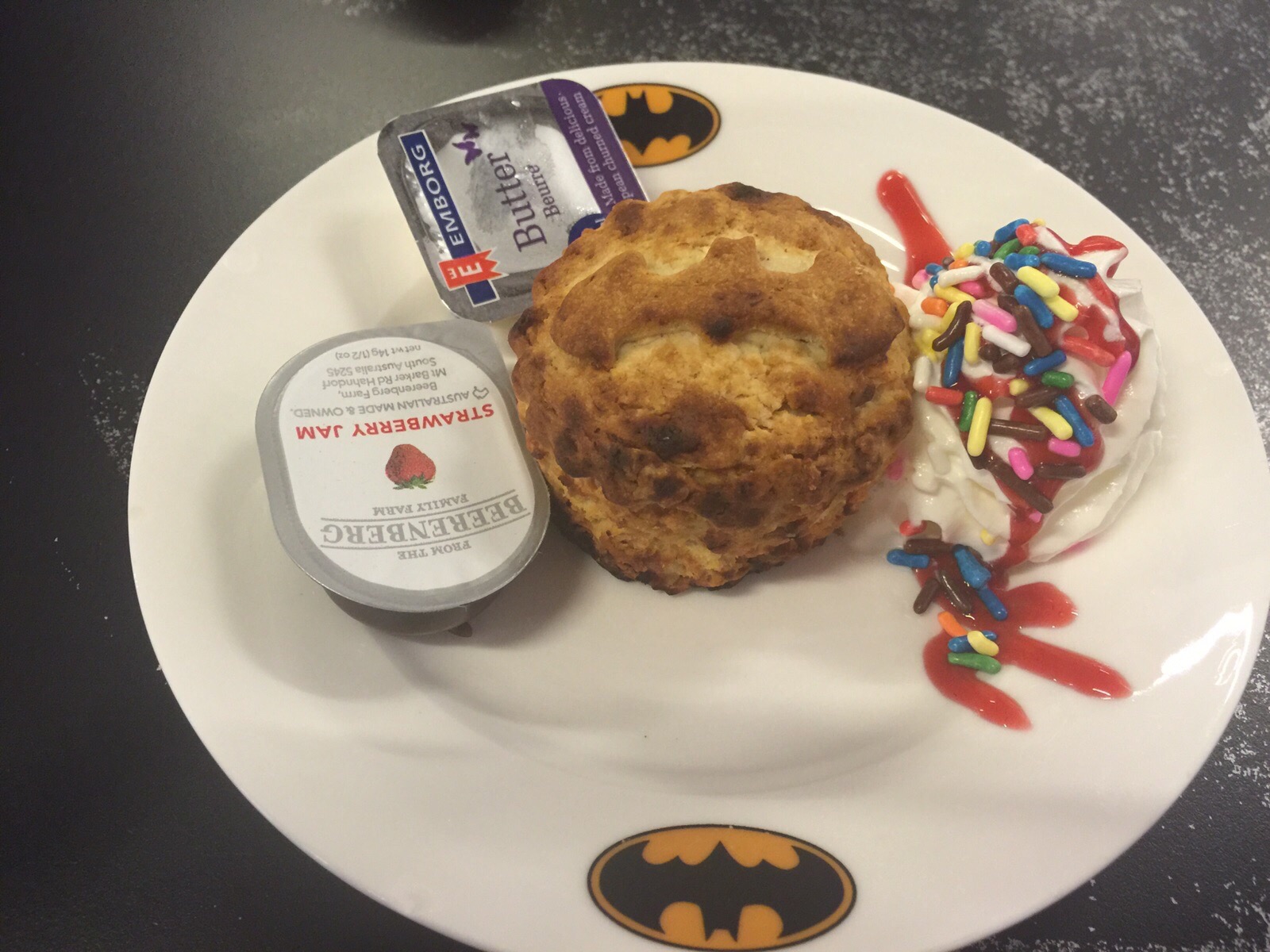 Served with butter and jam. Really crusty on the outside and it was really buttery and just right for my liking.
