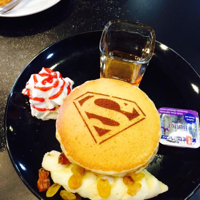 Still an edible fluffy pancake with a superman chocolate powder on top.