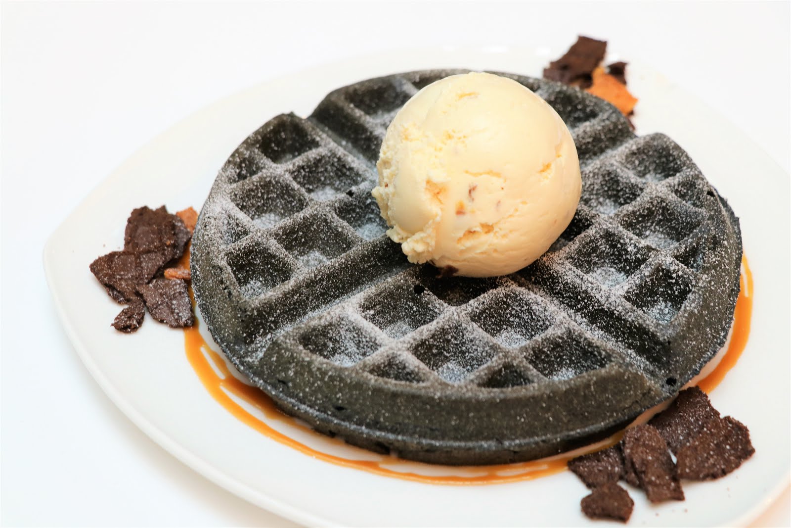 Charcoal waffle topped with rum and raisin Ice Cream.