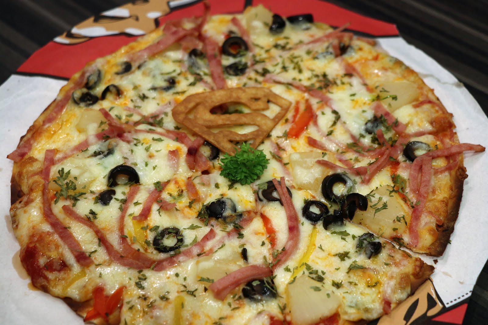 Classic marinara sauce with mozzarella cheese topped with turkey ham slices, pineapple ring, fresh green, red and yellow capsicum slices and black olives.