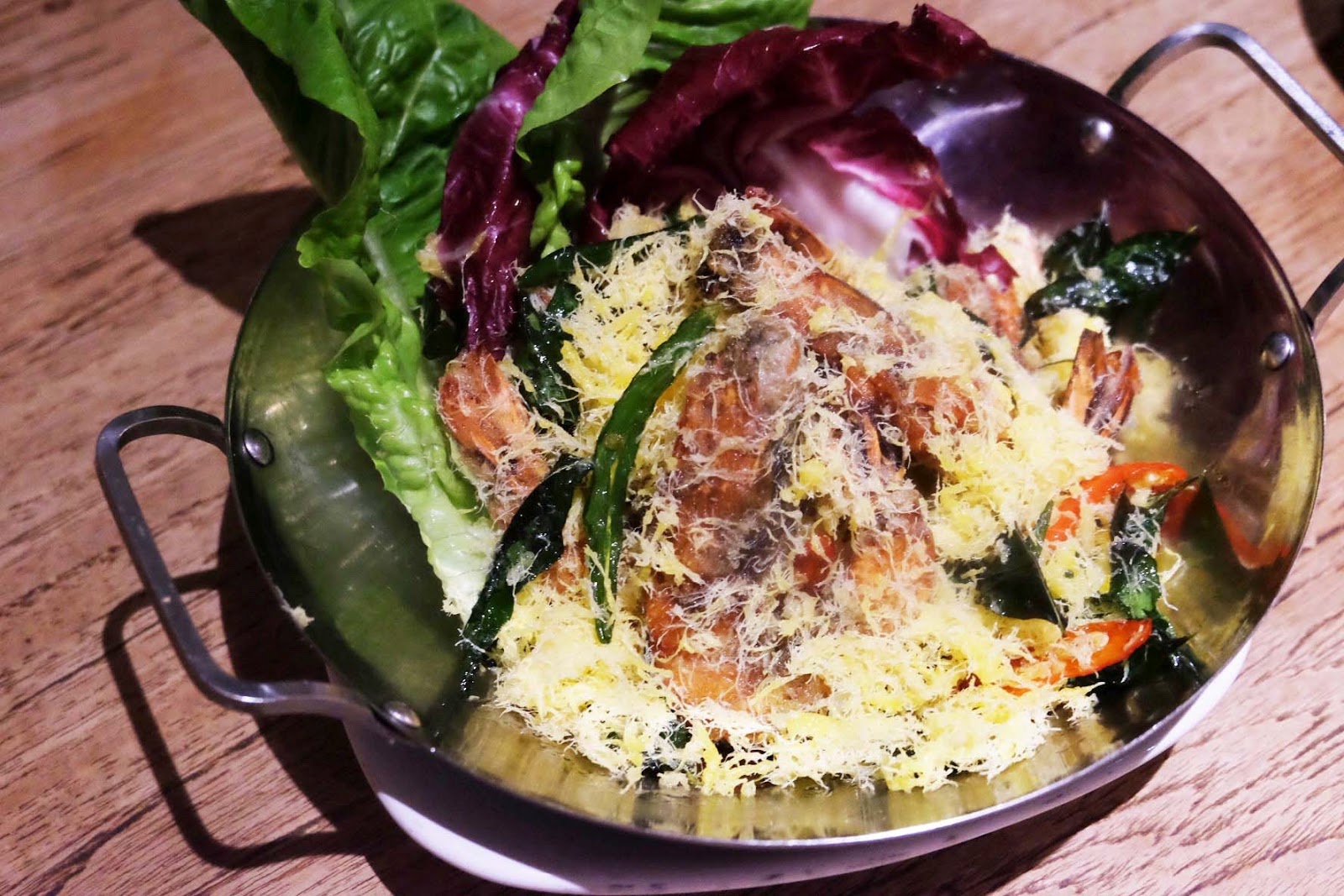 Butter prawns cooked with egg yolk, chilli and curry leaves