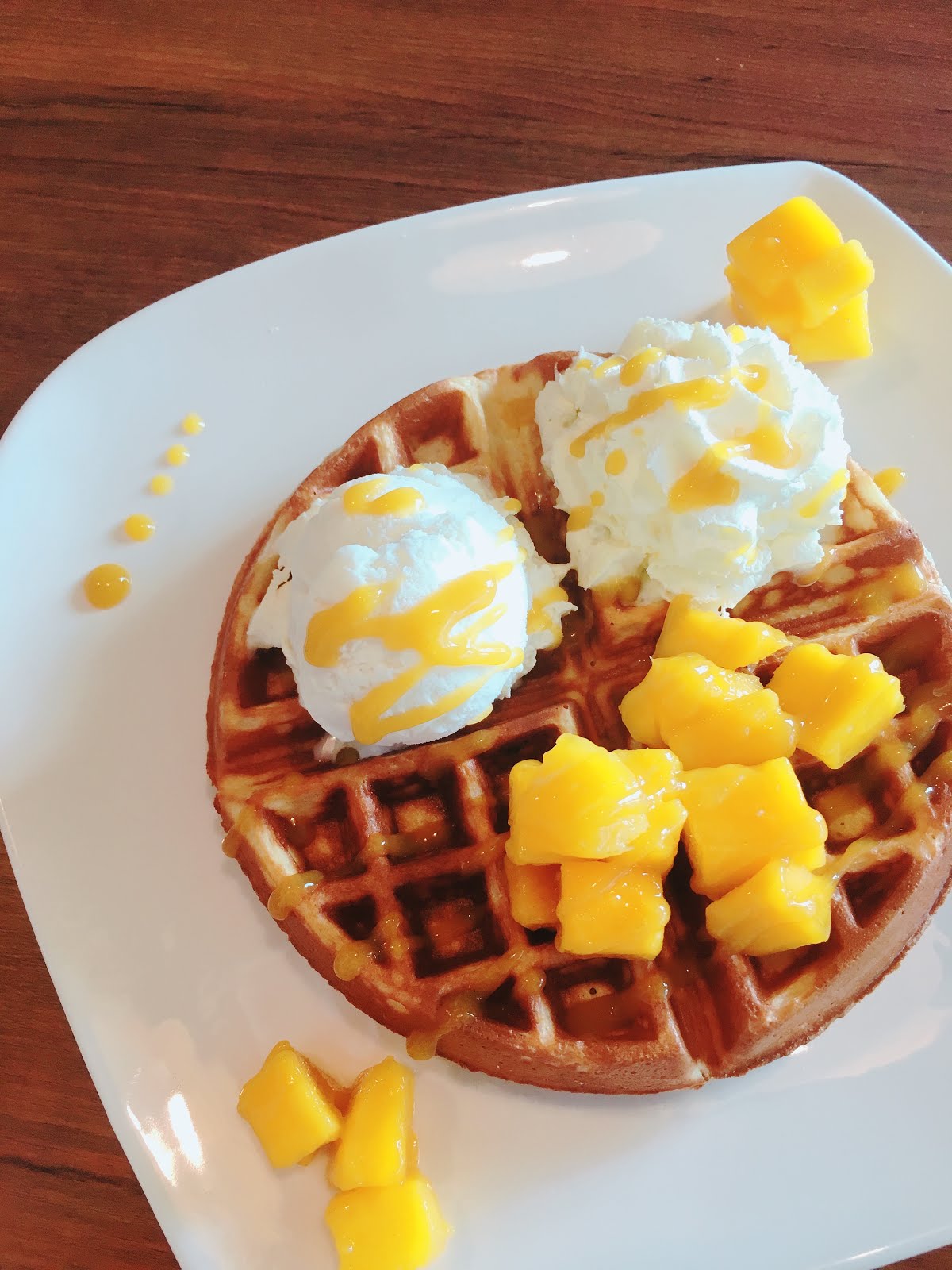 The waffle was thick and dense. Slightly crispy on the exterior but moist and soft on the inside, just the way i like my waffles to be done. Served with fresh huge mango cubes, generous scoop of vanilla ice cream and fresh cream, drizzled with mango sauce.