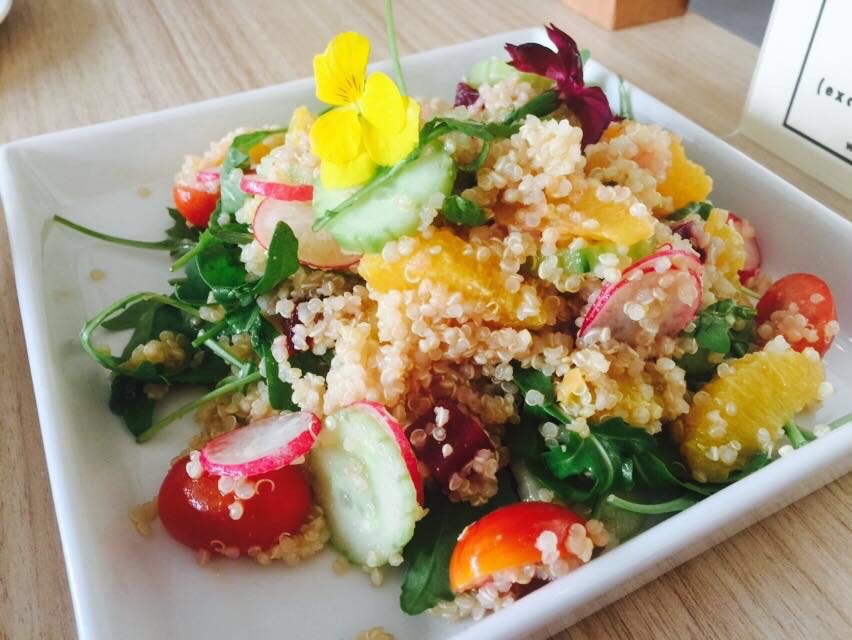White organic quinoa, fresh mint, roasted beets, orange wedges, sliced kyuri, hummus, miso vinaigrette. This salad is truly a beauty that tastes wonderful. All the ingredients complement each other perfectly.