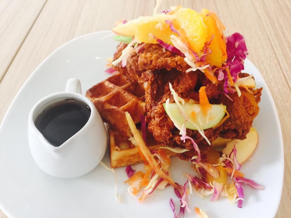 Waffles, fried chicken, citrus slaw, orange wedges, and maple syrup. A classic. Who could resist a crispy and airy waffle topped with a gorgeous fried chicken? The citrus slaw makes the whole dish light and refreshing.