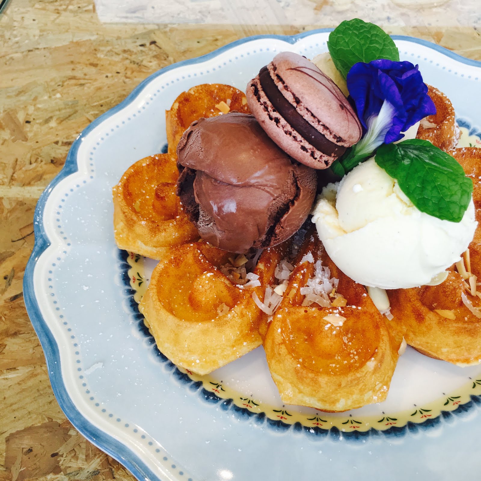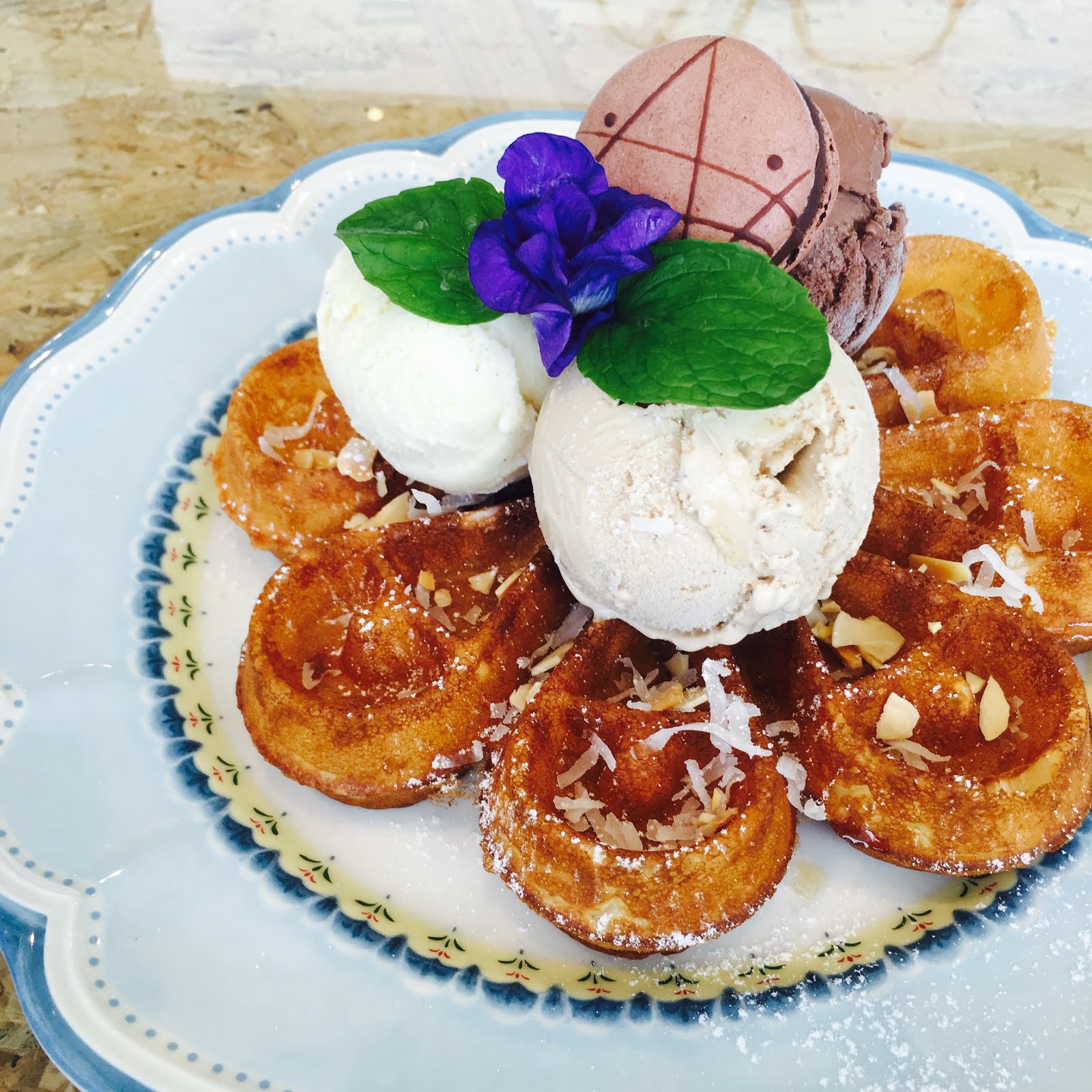 One of their bestselling waffle that is beautifully crisp on the outside, and airy on the inside. Served with a generous amount of three scoops of homemade ice cream (chocolate, vanilla & earl grey flavored), a macaroon, and finished off with some coconut flakes, nuts, and icing sugar. This would make a perfect dessert which is not too heavy.