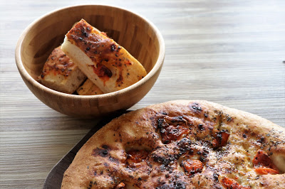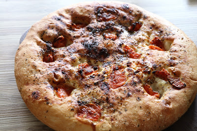 A flat oven-baked Italian bread product similar in style and texture to pizza doughs. Topped with herbs, tomatoes, and cheese in the centre.