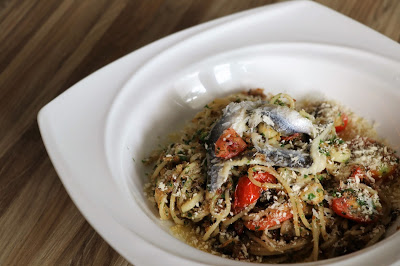 Cooked with anchovies, pecorino cheese, baby tomatoes, herbs, garlic and chili flakes. The anchovies omits a very strong smell and contribute to the umami flavour. The crumb-coated spaghetti was interesting and delicious as well.
