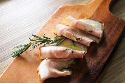 Black pork belly slow cook for seven hours and marinate for two days with herbs and rosemary. Kept cold, thinly sliced and full in flavour.