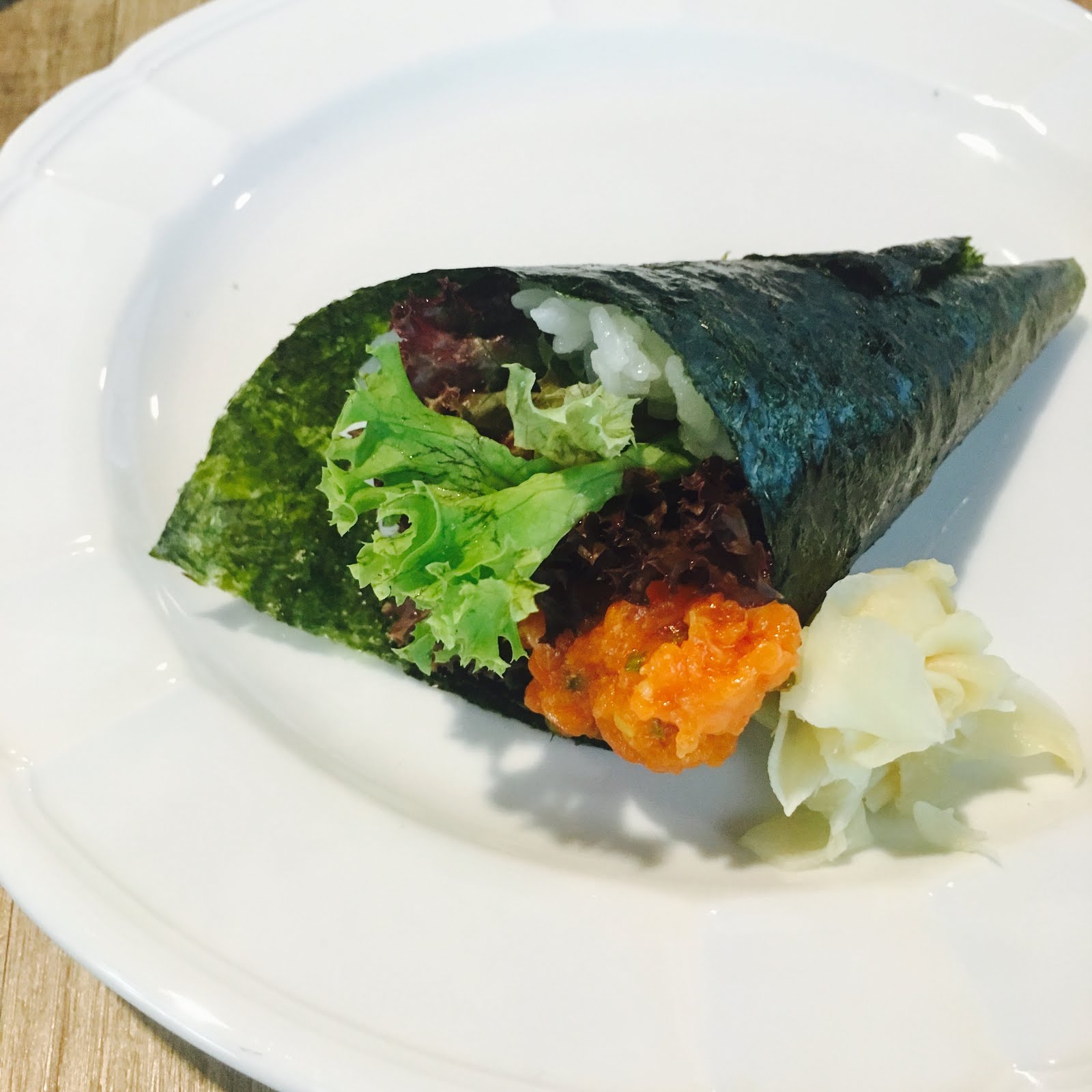 Freshly made handroll which comprises of japanese vinegared rice, spicy raw salmon and coral lettuce. Could be better if the seaweed sheet was more crispy.