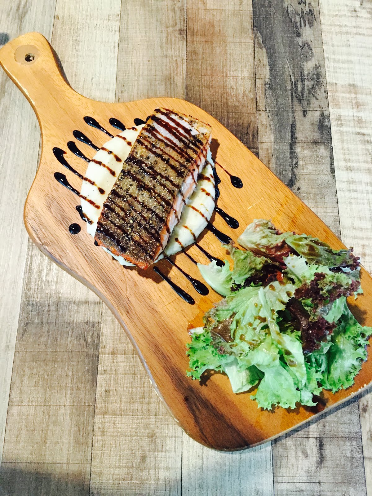 Perfectly well done salmon fillet which is fresh and well seasoned. Balsamic reduction sauce was lovely and not overpowering with the beautiful mash underneath.