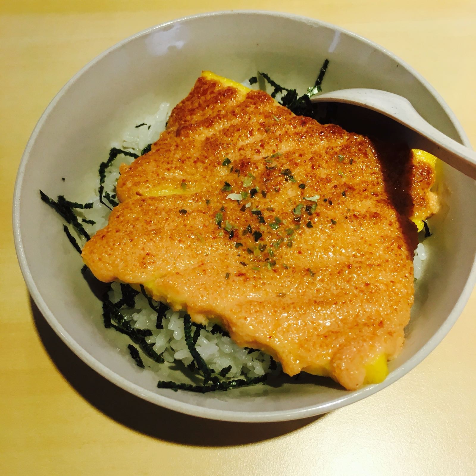 Mentaiko, tamago and seaweed atop the hill of soft and warm steamed rice. Rice was cooked well. Tastes delightfully scrumptious with the texture of seaweed bream, the slightly sweet tamago egg, and the savory mentaiko paste. This was really da bomb and ‘the-must’ to order.