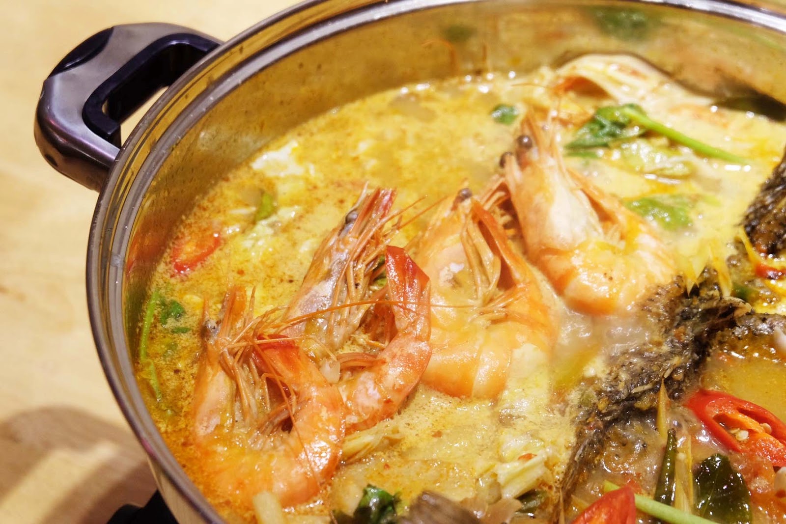 A specially customised seafood pot served with their signature Tom Yum with whole fried fish, asari clams, 6 XL tiger prawns, squid, scallops and mushrooms. The tom yum is very flavourful and not too spicy.