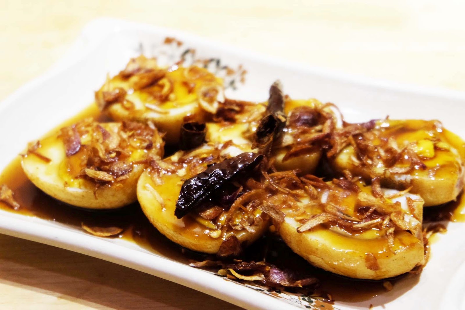 Fresh boiled eggs served with Thai tamarind sauce and fried onions. The tamarind sauce is sweet and flavorful.
