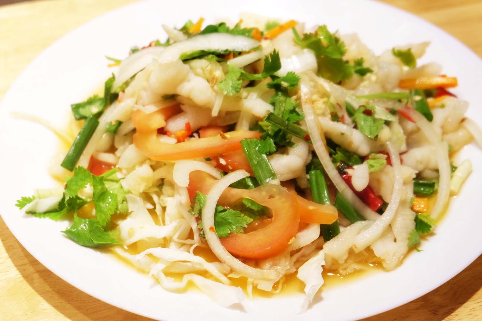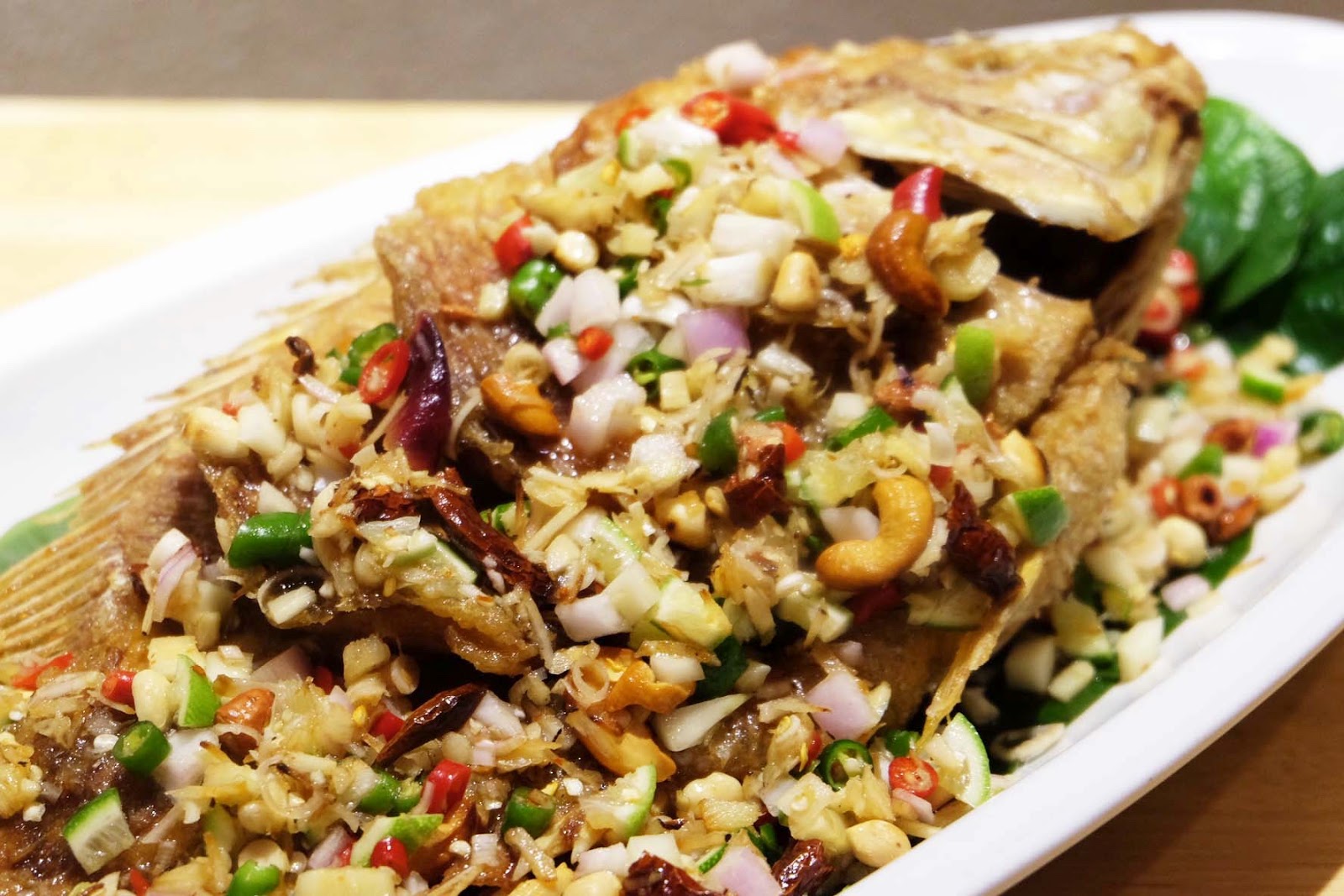 Deep fried fish slices tossed with miang kham ingredients and mixed sour spicy sauce. Seasonal flavors in every bite. Don’t be deceived by appearances, it is not as spicy as it looks.