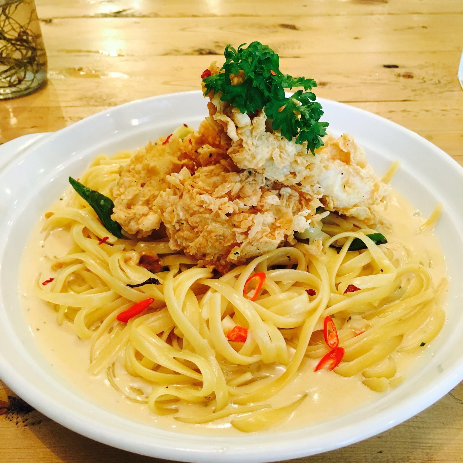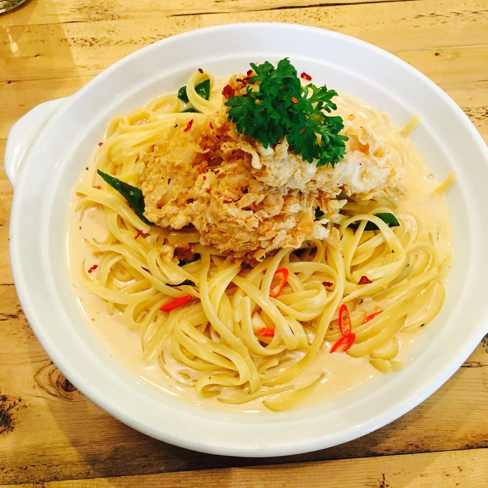 Cream based linguine cooked in an Asian style served with deep fried Tempura Prawns & Calamari.